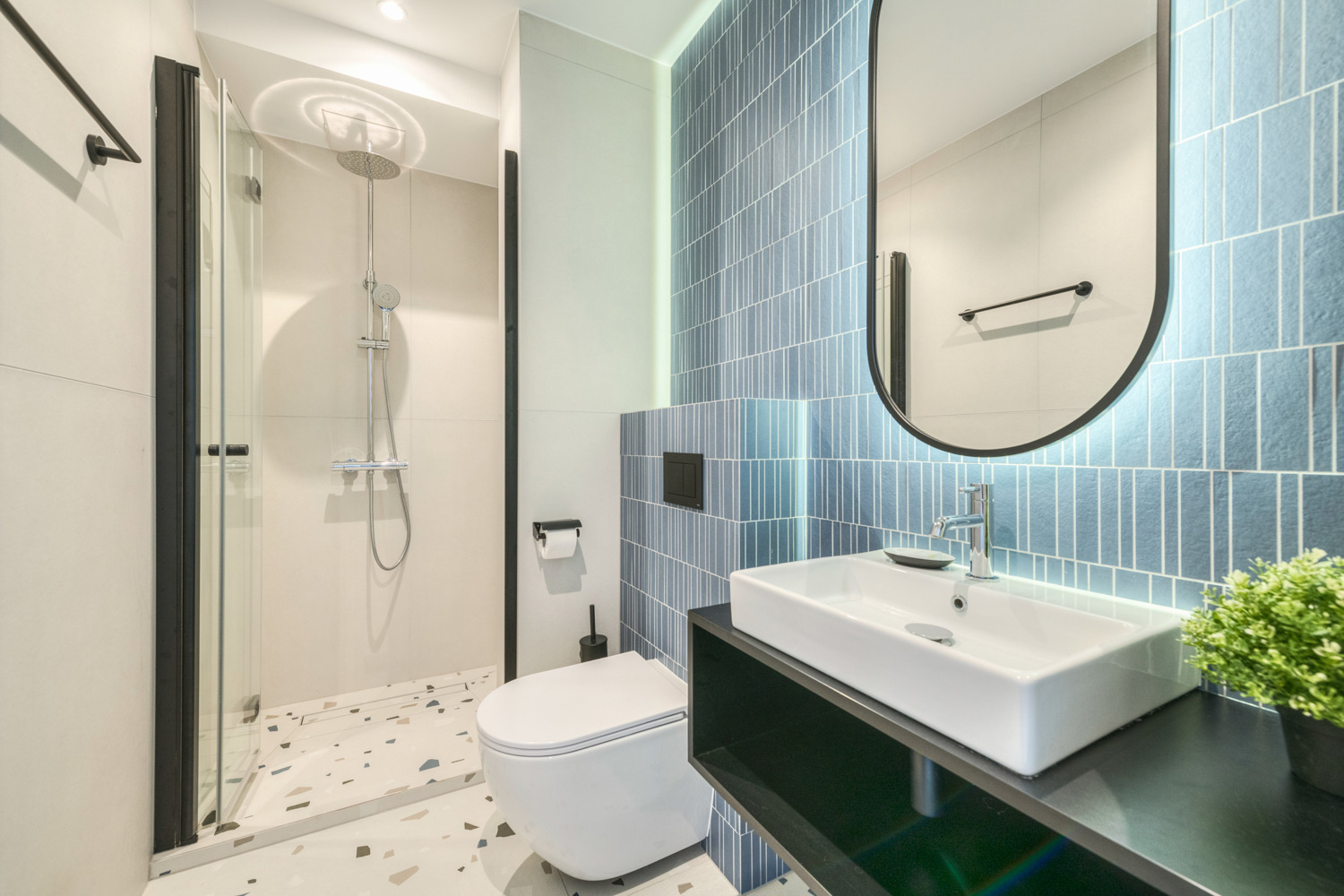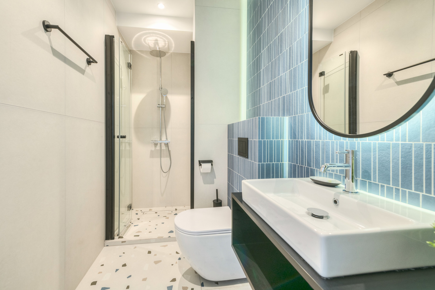 W łazience zastosowano połączenie płytek terrazzo i intensywnej niebieskiej glazury, co nadaje jej nowoczesny, wyrazisty charakter. W apartamencie znajduje się klimatyzacja, a elektroniczna klamka umożliwia szybkie i bezkontaktowe zameldowanie. Lokalizacja w centrum Gdańska to doskonały wybór dla tych, którzy chcą odkrywać miasto pieszo – tuż obok czekają kawiarnie, restauracje i nadbrzeże Motławy.