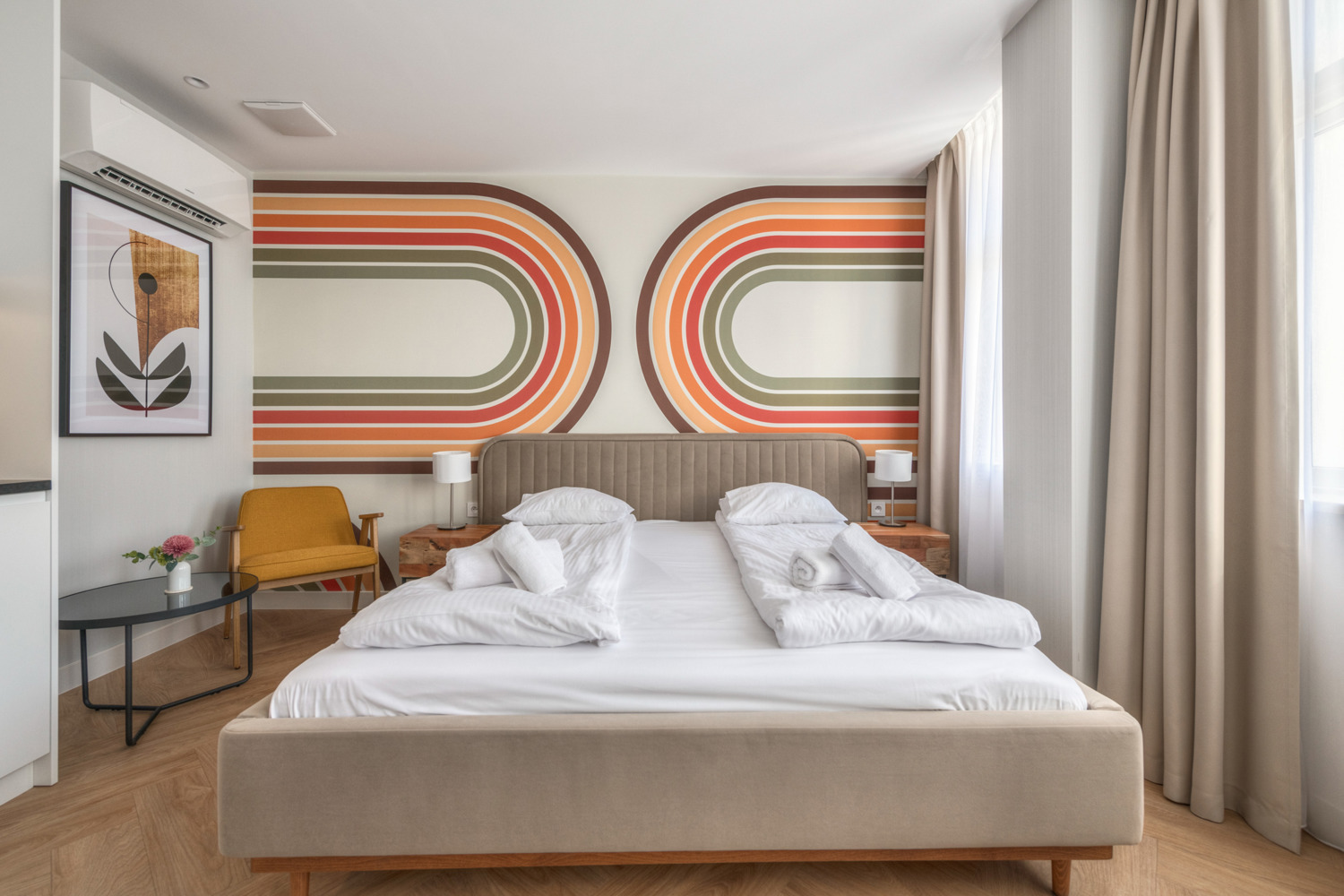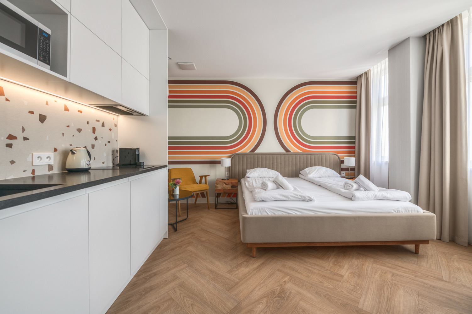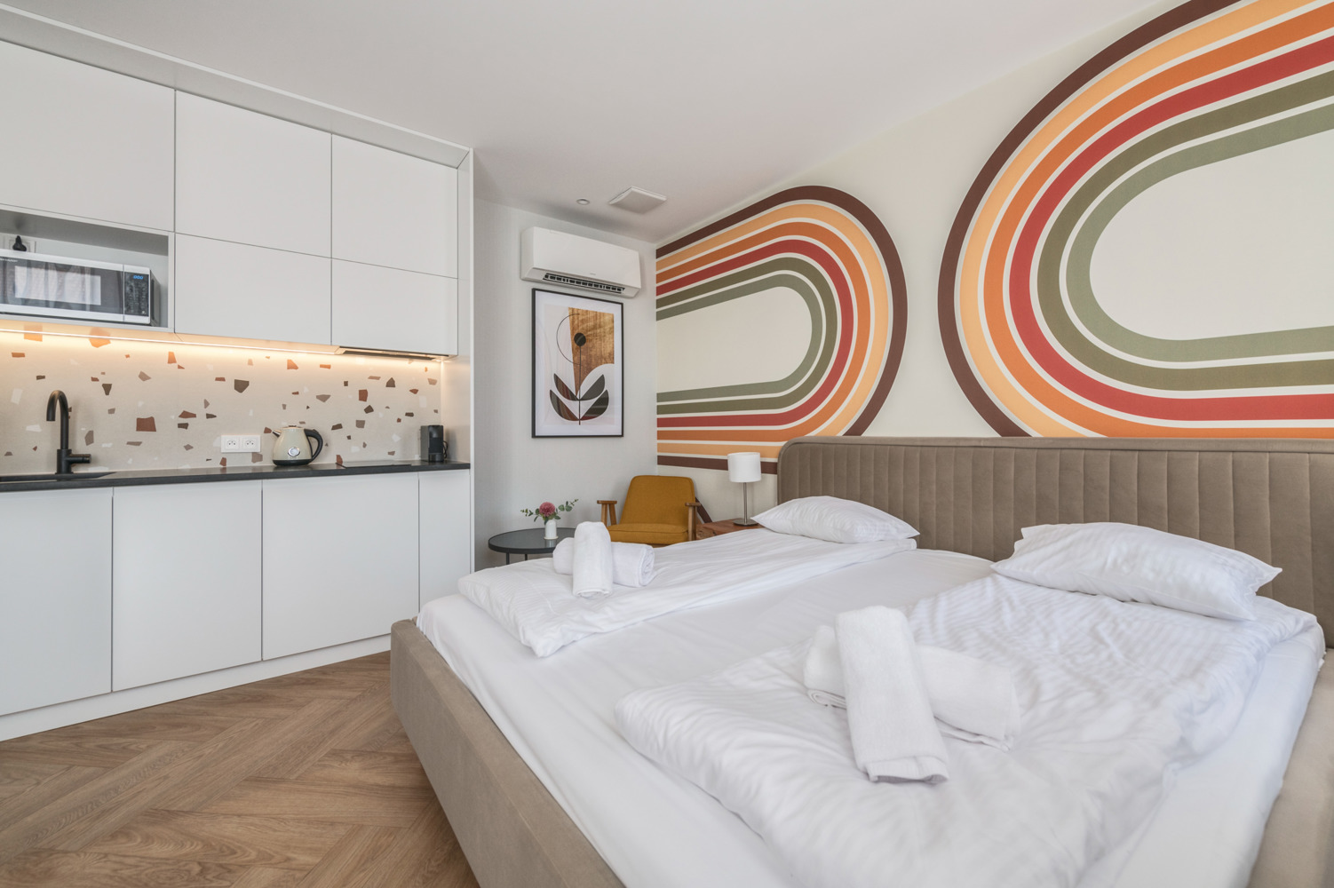 Retro Boutique 11 to przestronny apartament typu studio, w którym dominują stonowane odcienie zieleni i różu, uzupełnione ciepłym drewnem i geometrycznymi akcentami w stylu lat 70. W centralnej części znajduje się wygodne łóżko typu double, a tuż obok – strefa relaksu z designerskim fotelem i okrągłym stolikiem, idealnym na kawę lub kolację. Aneks kuchenny wyposażono w ekspres do kawy, czajnik, mikrofalówkę oraz niezbędne akcesoria do gotowania.