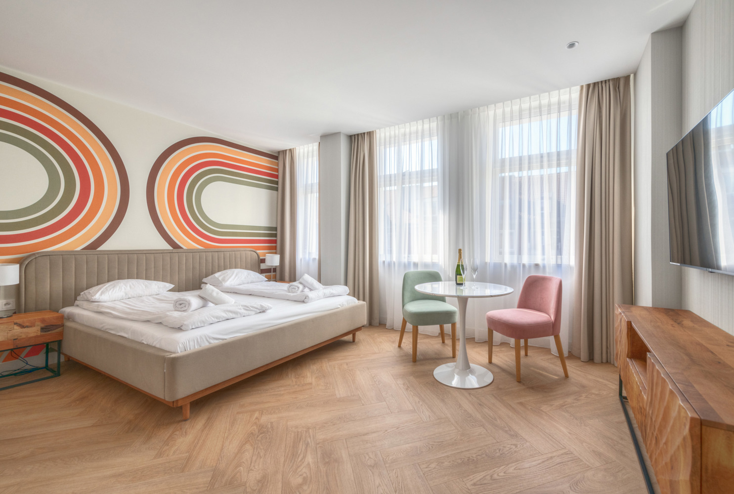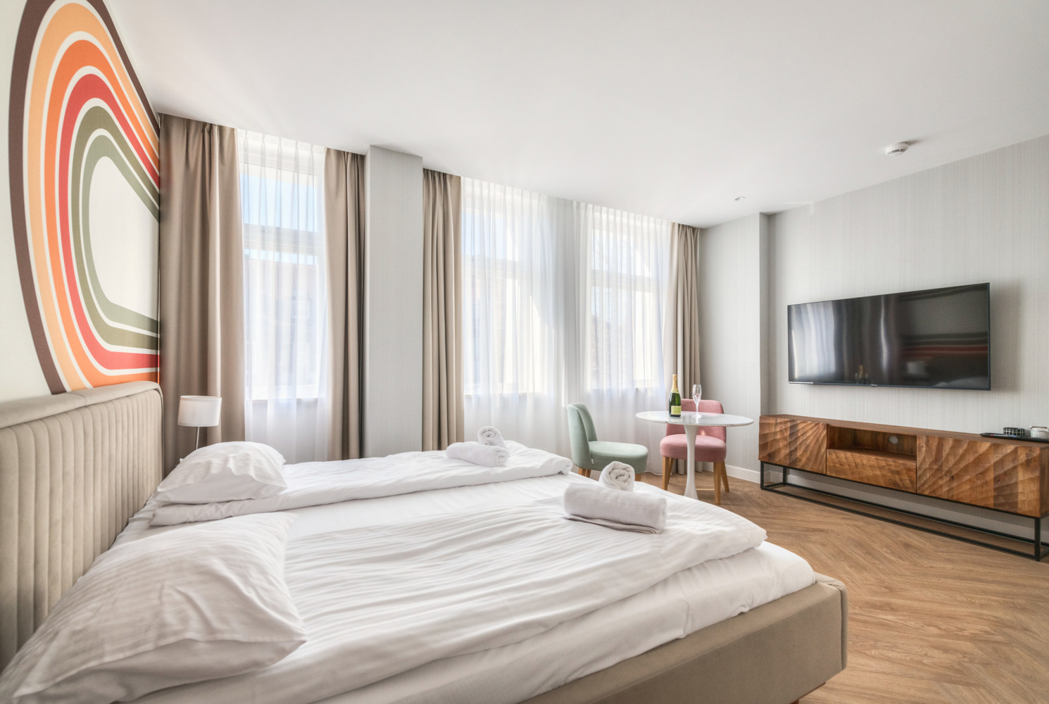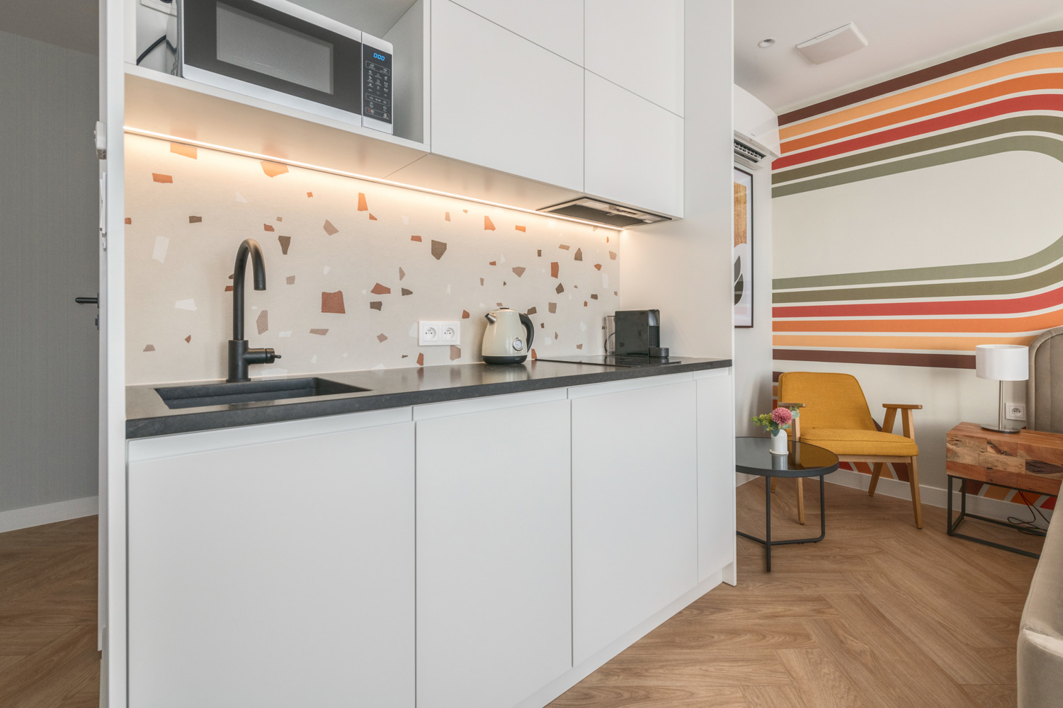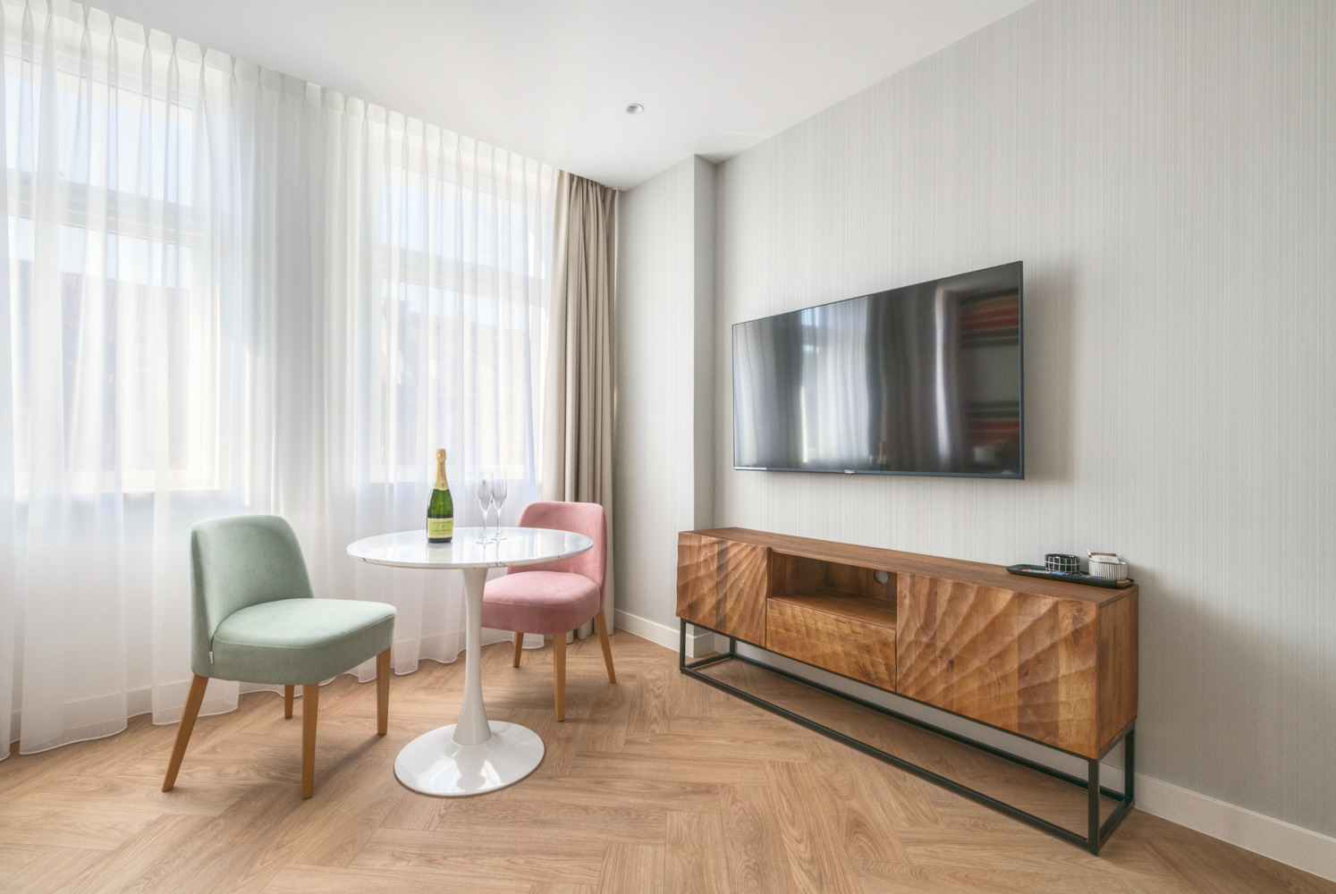 Retro Boutique 11 to przestronny apartament typu studio, w którym dominują stonowane odcienie zieleni i różu, uzupełnione ciepłym drewnem i geometrycznymi akcentami w stylu lat 70. W centralnej części znajduje się wygodne łóżko typu double, a tuż obok – strefa relaksu z designerskim fotelem i okrągłym stolikiem, idealnym na kawę lub kolację. Aneks kuchenny wyposażono w ekspres do kawy, czajnik, mikrofalówkę oraz niezbędne akcesoria do gotowania.