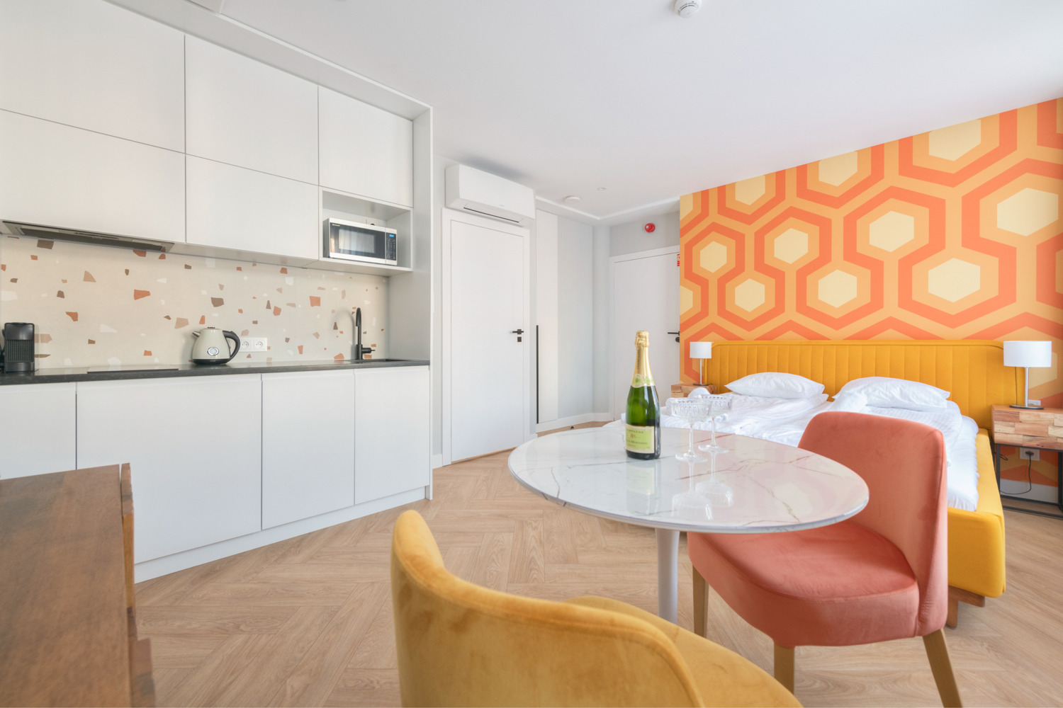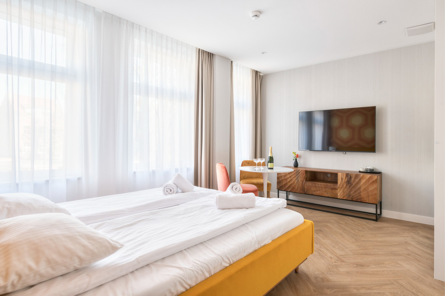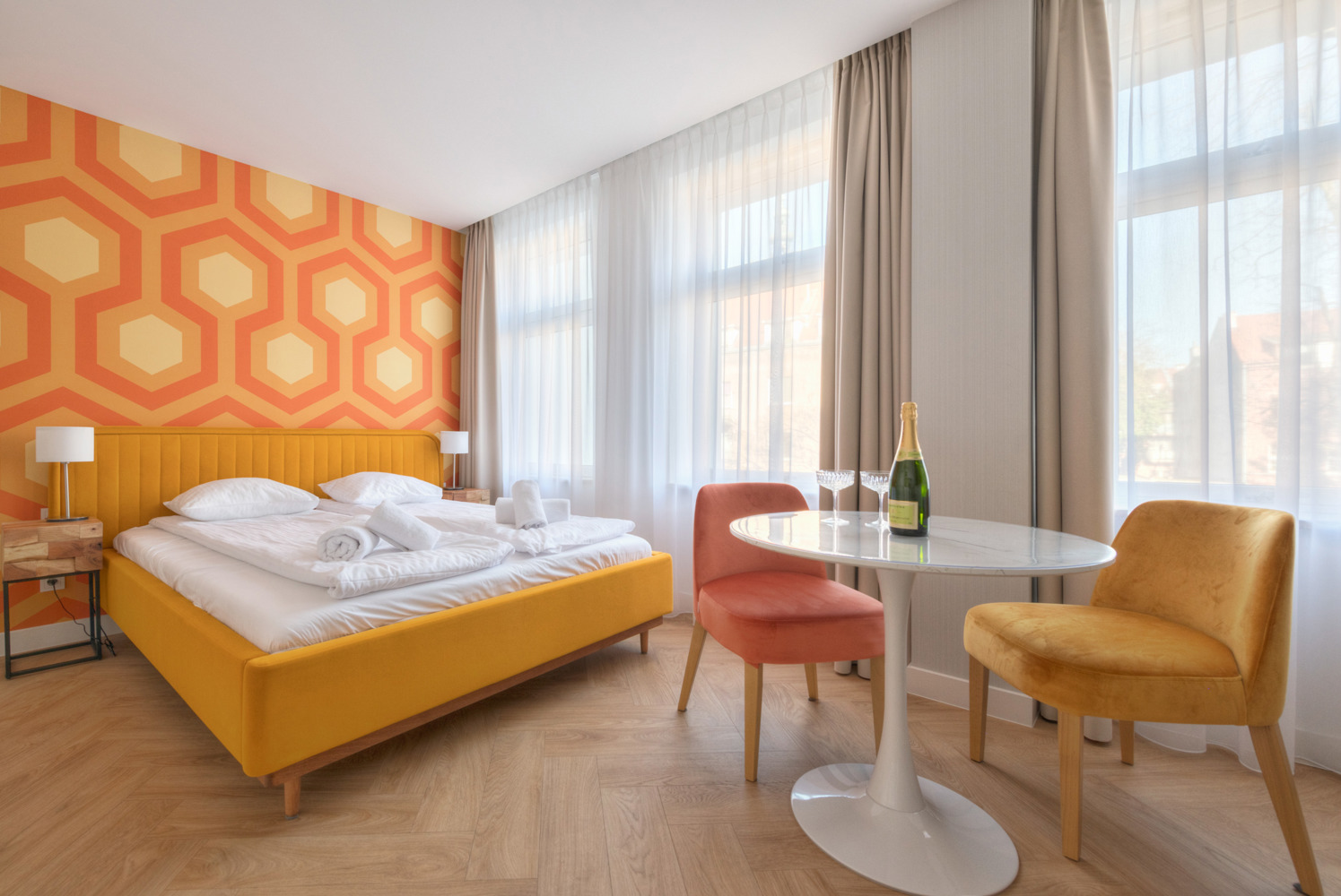 Retro Boutique 2 to jasny, funkcjonalny apartament typu studio, który zachwyca energetycznym wystrojem i przemyślanym układem wnętrza.