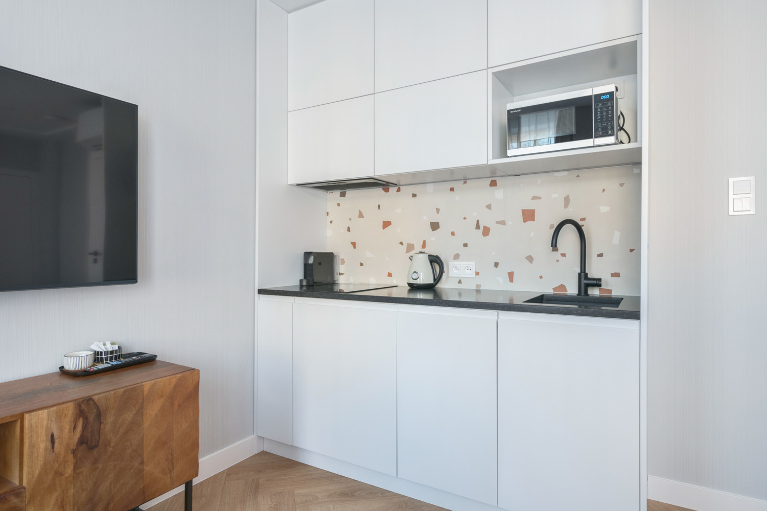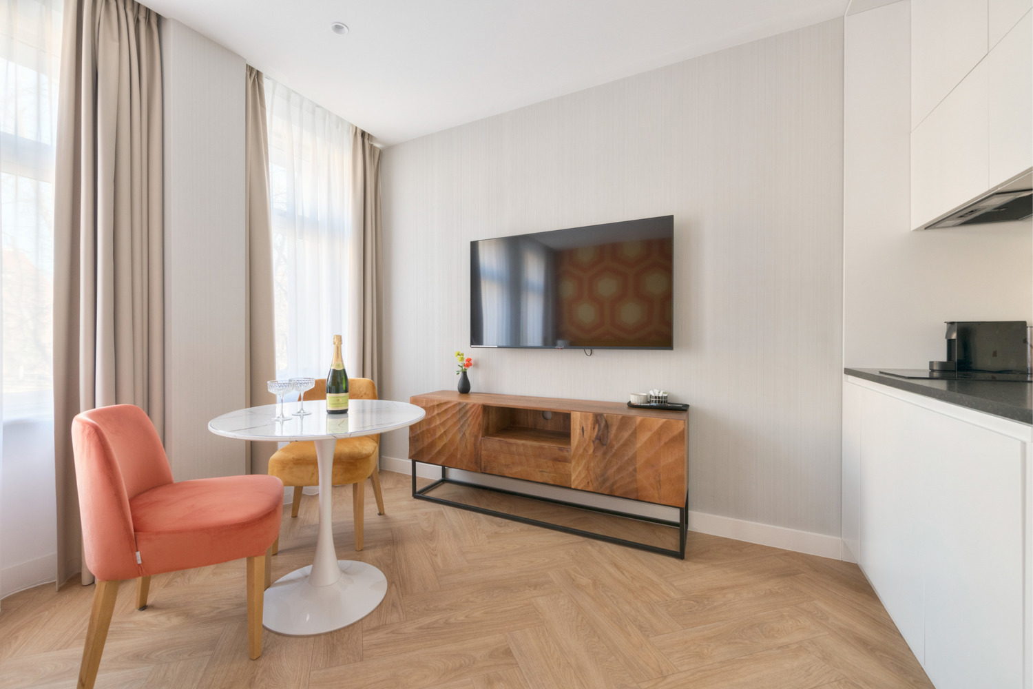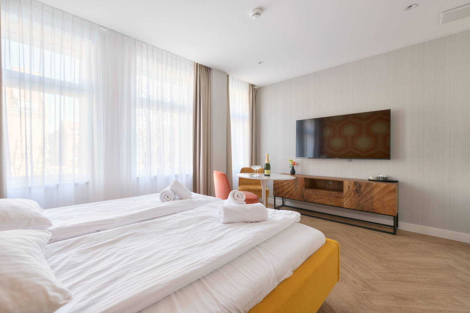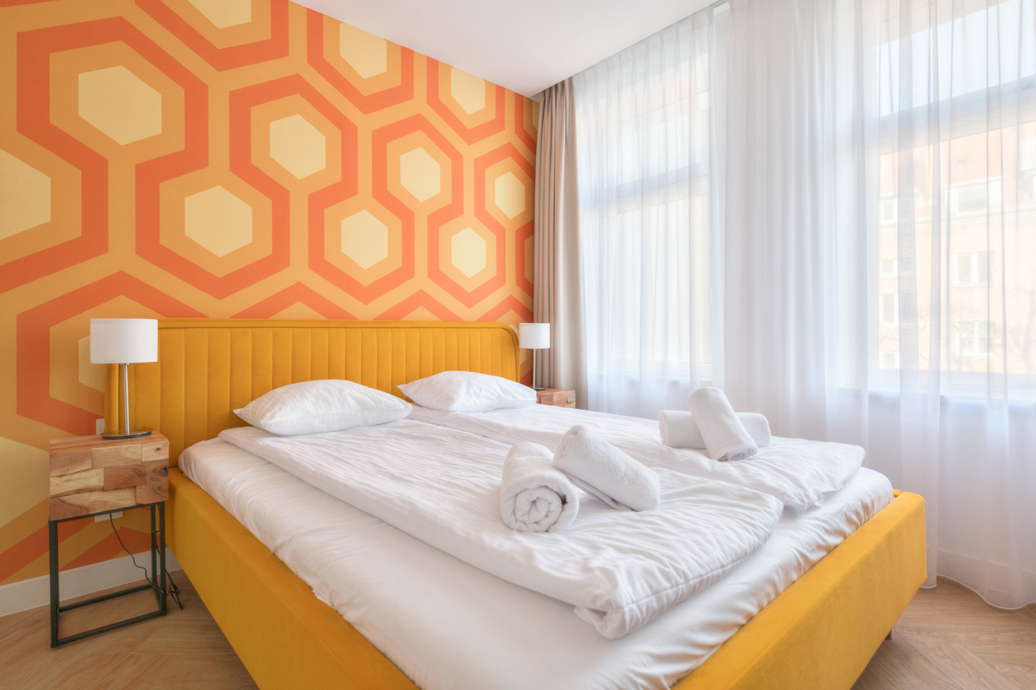 Retro Boutique 2 to jasny, funkcjonalny apartament typu studio, który zachwyca energetycznym wystrojem i przemyślanym układem wnętrza.