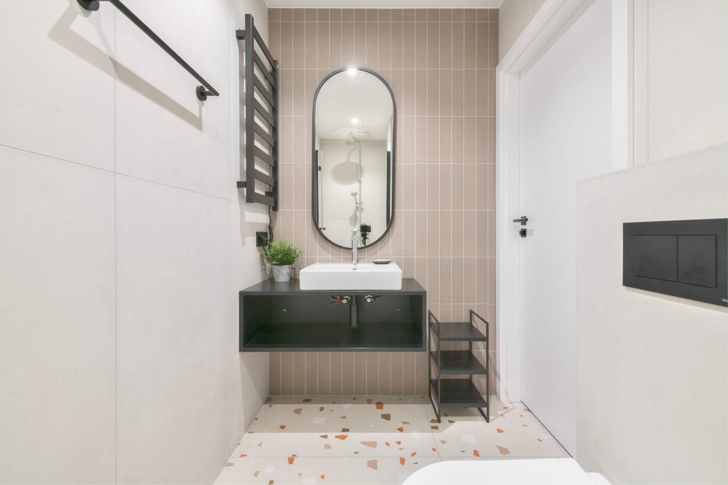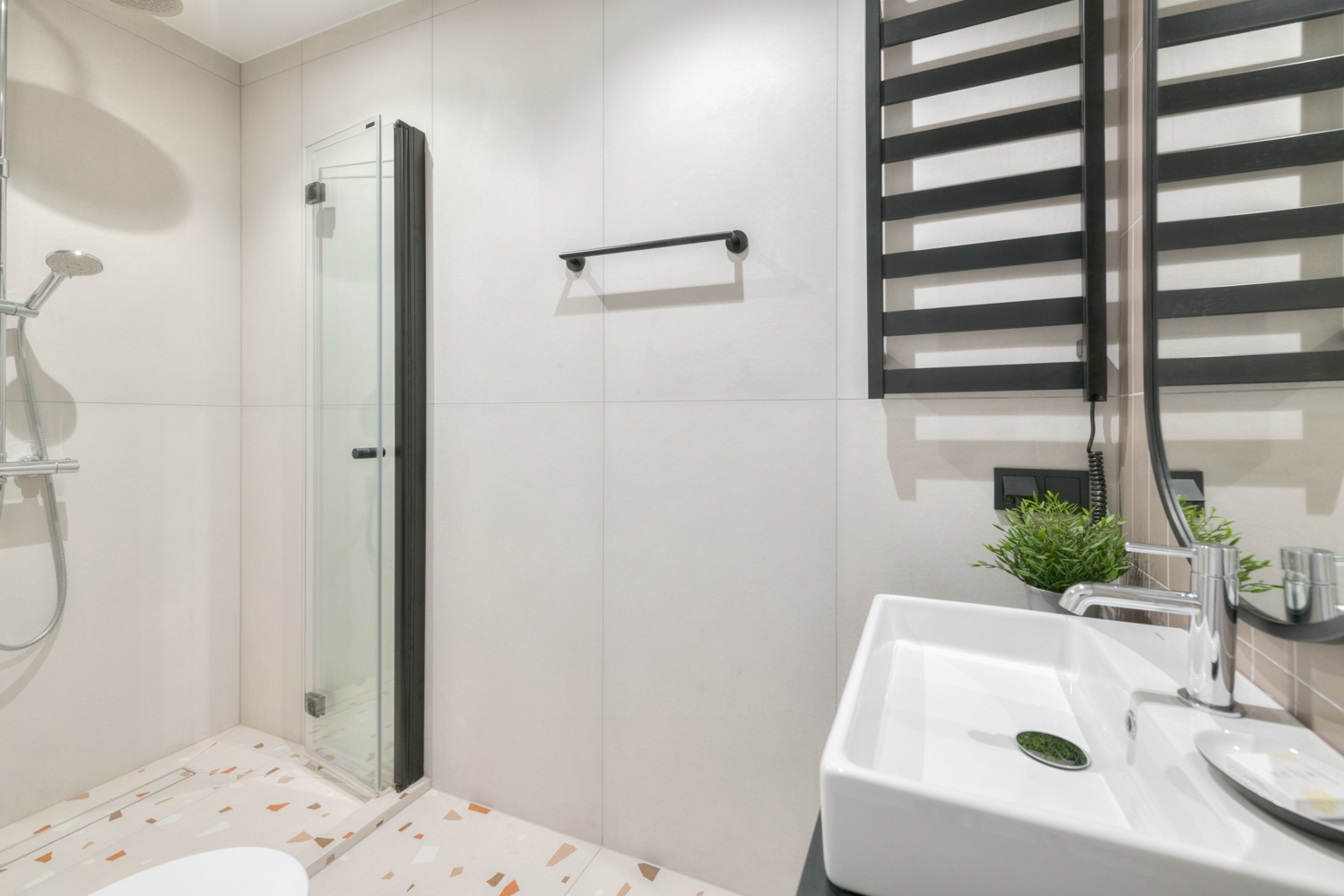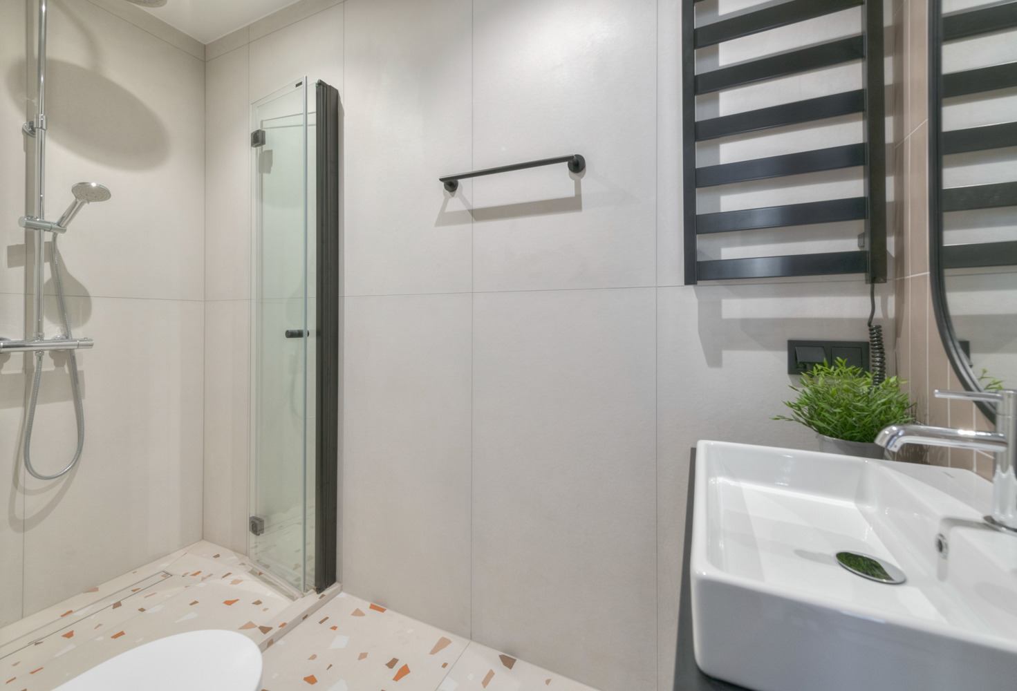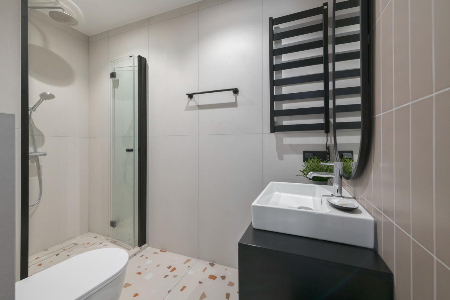 Łazienka z kabiną prysznicową wykończona została w nowoczesnym stylu, z detalami w stylu terrazzo i kontrastującą armaturą.
