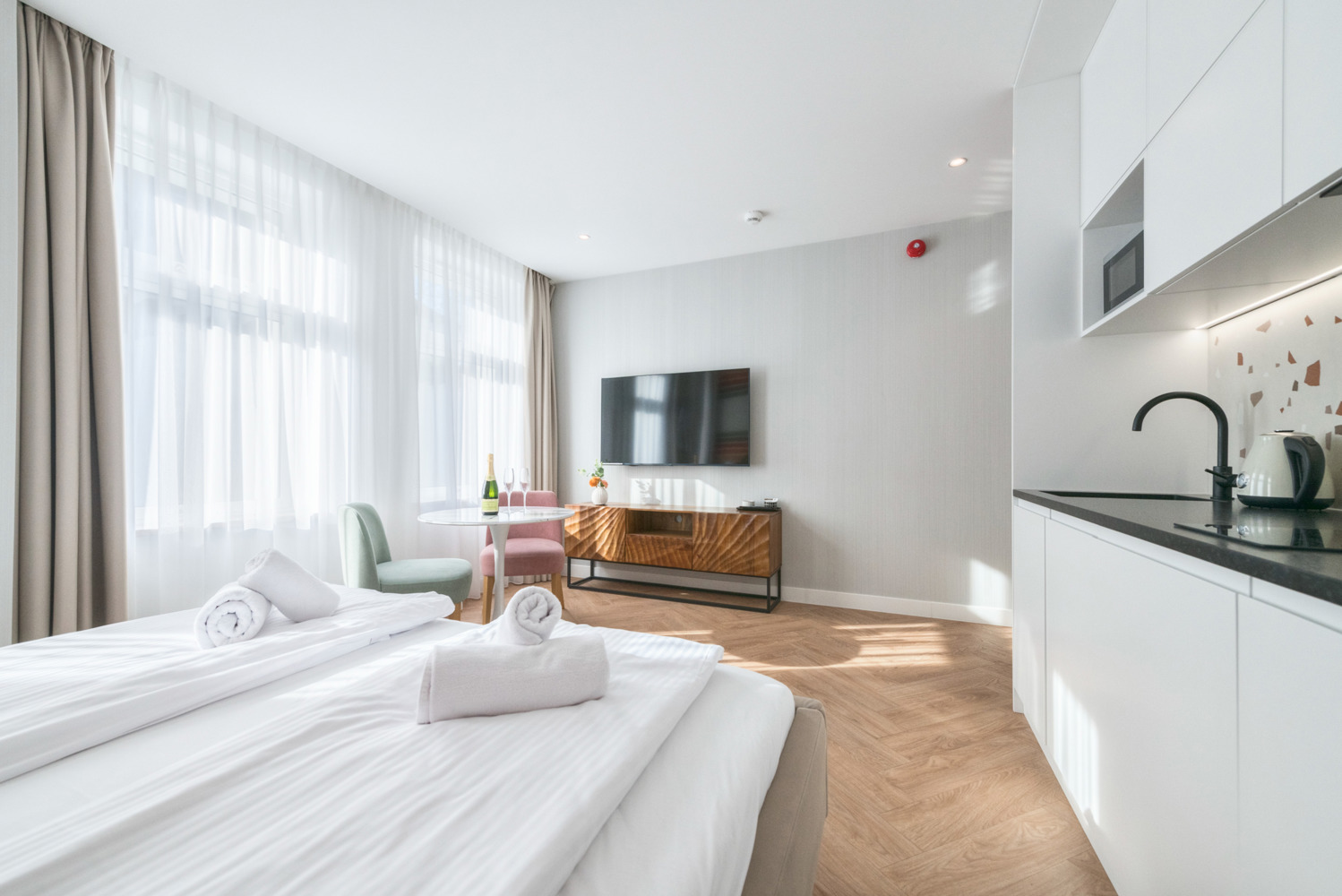 Wygodne łóżko typu double, aneks kuchenny z ekspresem, czajnikiem i mikrofalówką oraz niewielka strefa jadalniana tworzą funkcjonalną przestrzeń.