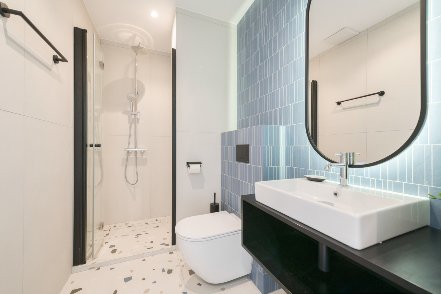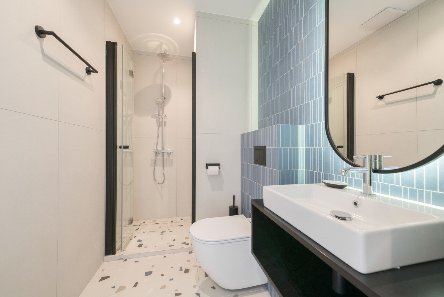 W apartamencie znajduje się klimatyzacja, a łazienka wykończona została w stylu terrazzo z niebieską glazurą i kontrastową armaturą.