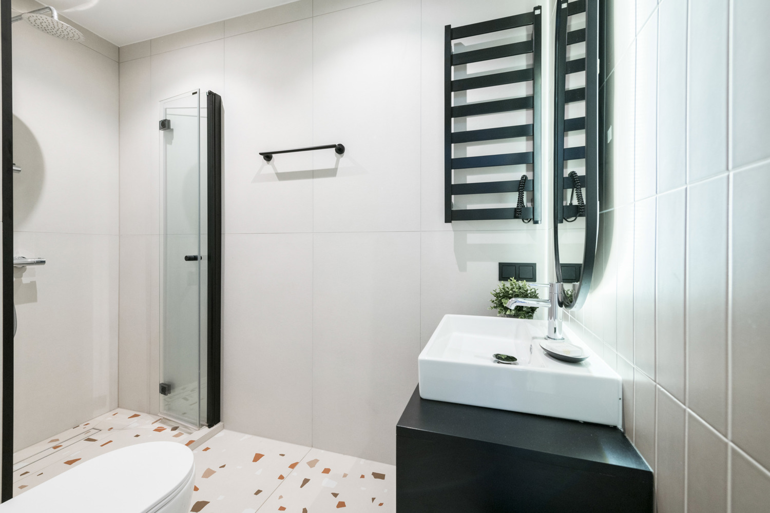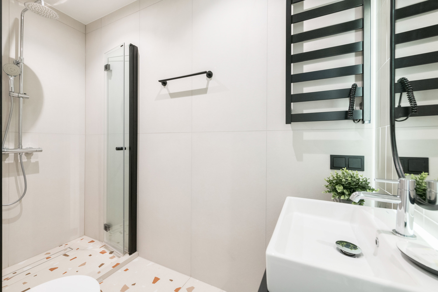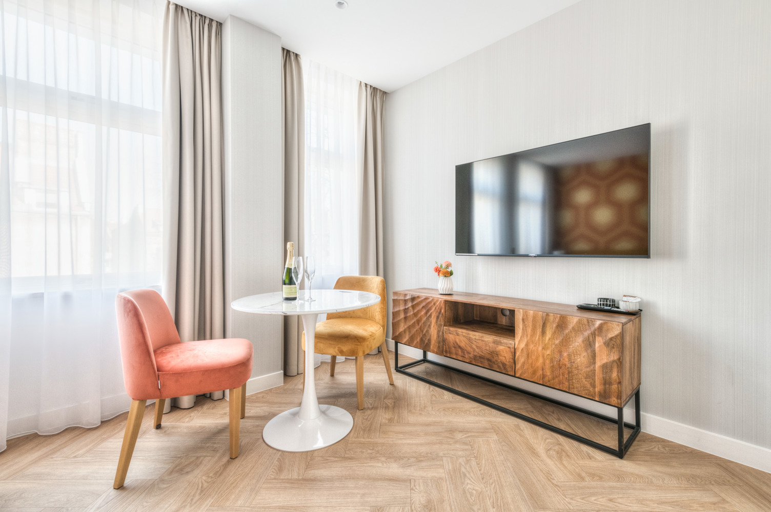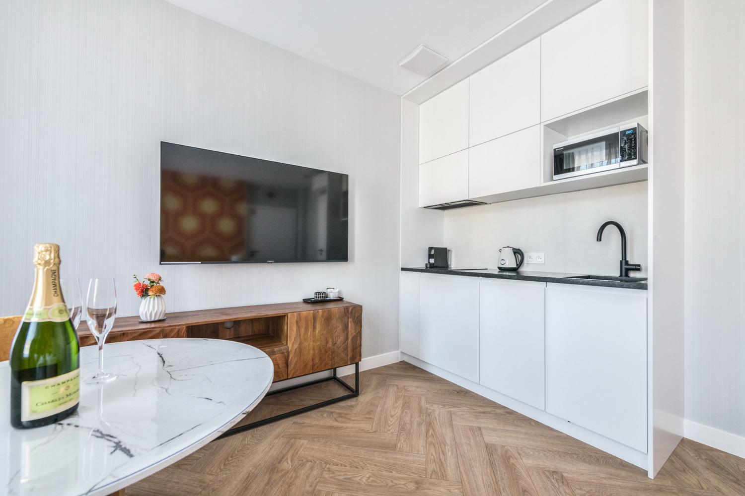 W apartamencie znajduje się wygodne łóżko typu double, część jadalniana z marmurowym stolikiem i designerskimi krzesłami oraz aneks kuchenny wyposażony w mikrofalę, ekspres do kawy, czajnik i niezbędne akcesoria. Stylowa łazienka utrzymana jest w bieli, z detalami terrazzo i czarną armaturą. Duży telewizor i klimatyzacja zapewniają wygodę, a elektroniczna klamka umożliwia samodzielne zameldowanie.