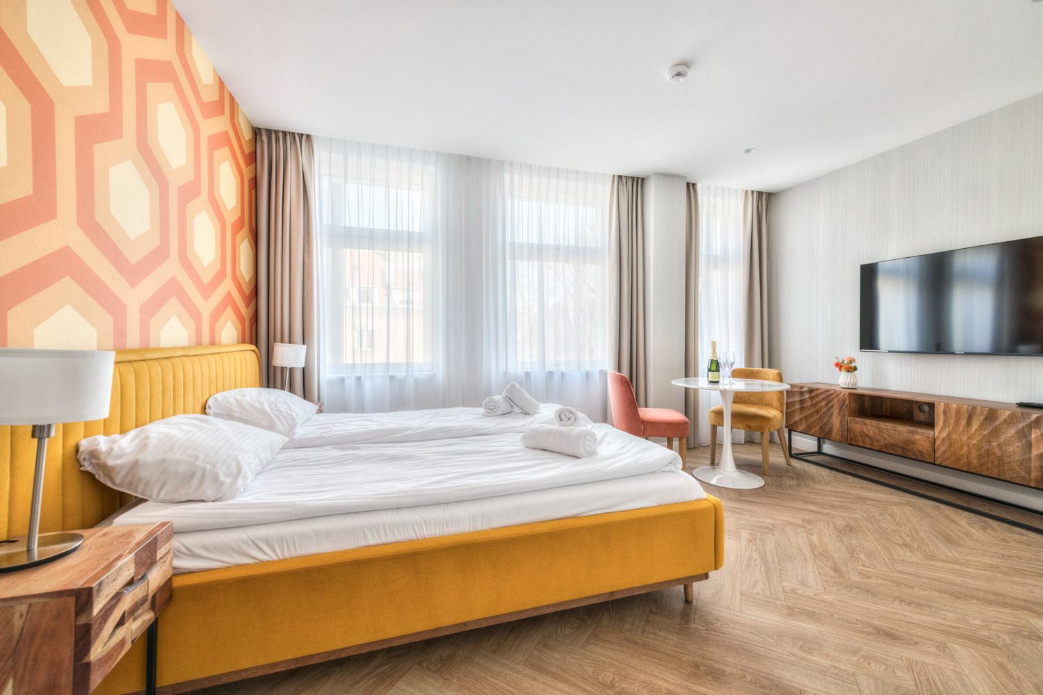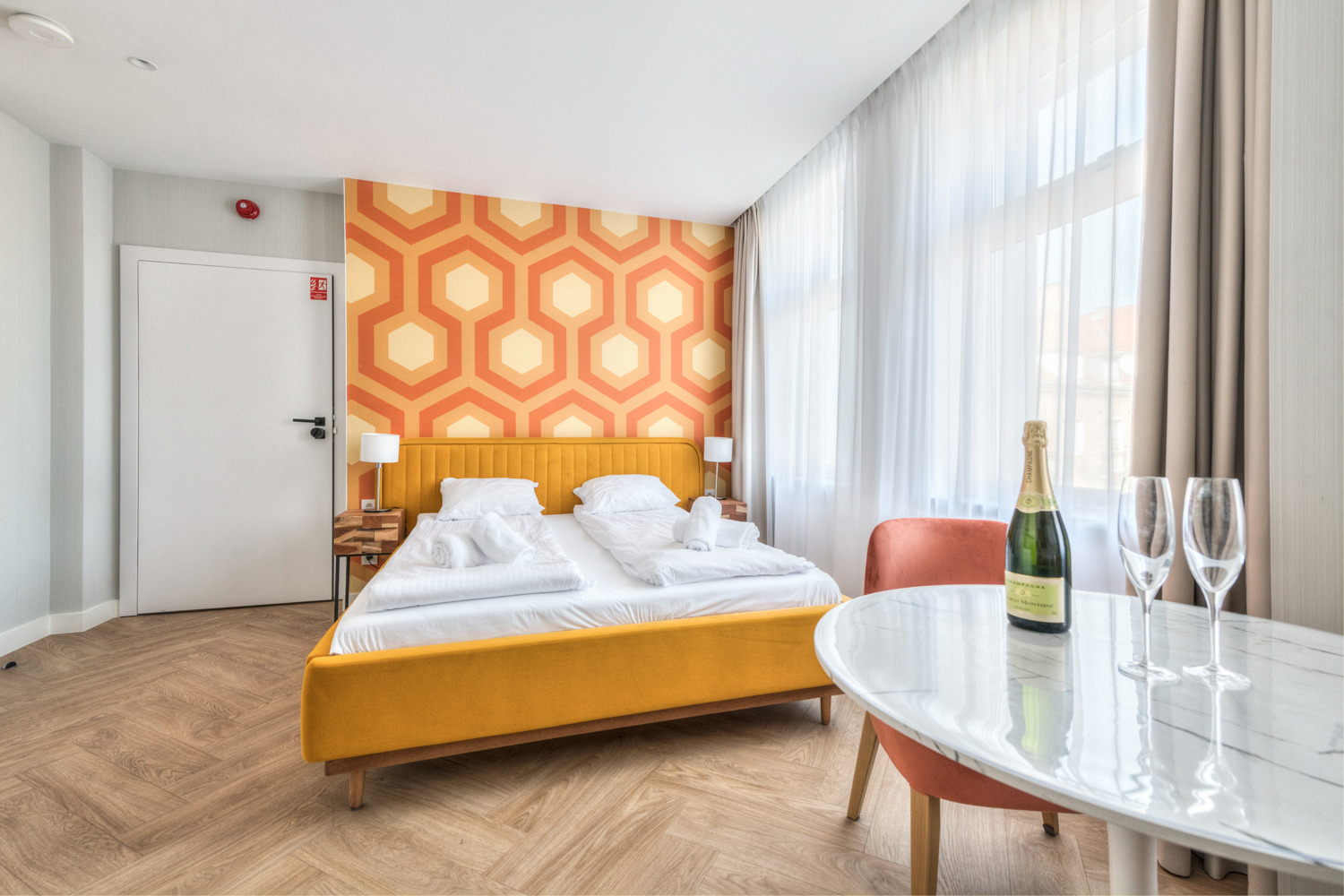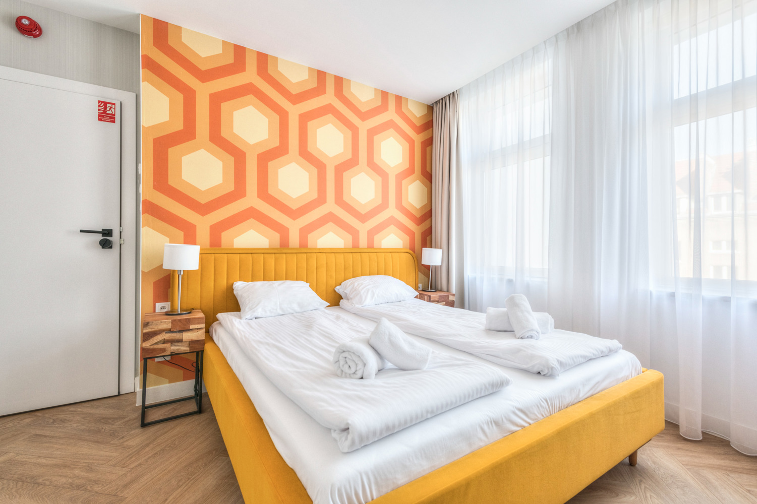 Retro Boutique 6 to jasny, stylowy apartament typu studio dla dwóch osób, inspirowany estetyką lat 70. Ciepła kolorystyka wnętrza – musztardowe, pudroworóżowe i brzoskwiniowe akcenty – w połączeniu z geometryczną tapetą i welurowymi tkaninami tworzy unikalny, przytulny klimat.